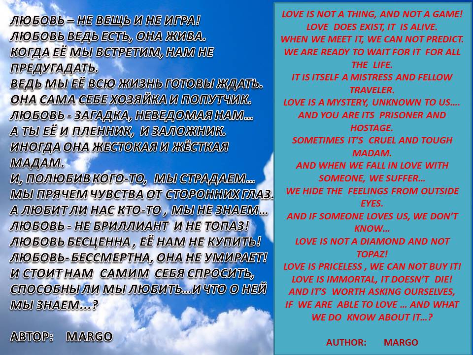 Целую в щёчку нежно я тебя...Дружбанчик в юбке, твоя Маргушечка! На протяжении всей этой недели...Я знаю, много ты недосыпал. Но сделали мы то, чего хотели! Я знаю, что за меня всегда переживал. Ты нёсся как тот танк, не знал преграды! Ты тигр, лев, ты просто хищный зверь! И все мои- твои отнюдь награды! Не ищешь лёгких ты путей, а просто есть поставленная цель!!!!!!!